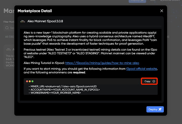 Before proceeding with deployment, you’ll notice a section containing environment variables. These variables are crucial for your deploy operation — they contain the connection details and authentication information needed to connect to the Blockchain GPU tasks pool.