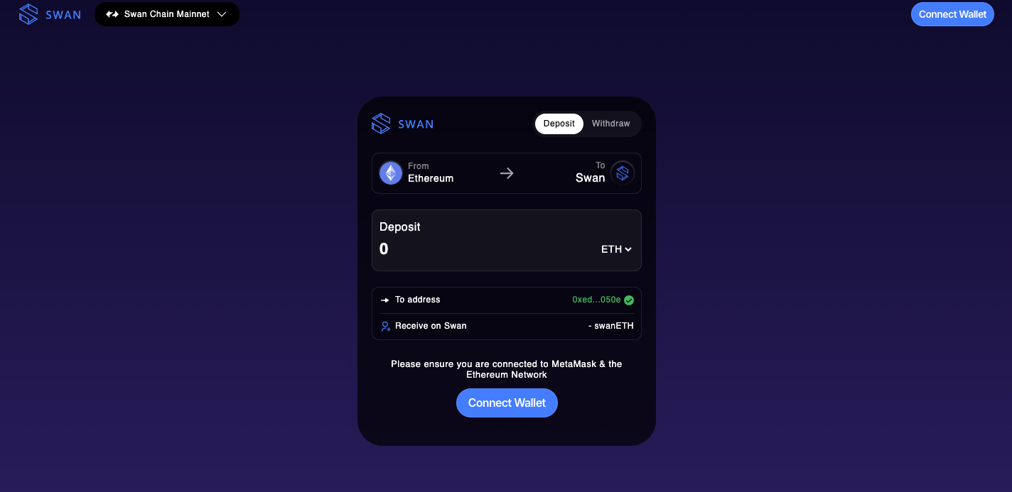 Go to[ Bridge](https://bridge.swanchain.io/), enter the amount of ETH you wish to bridge, and click on the "Deposit" button.