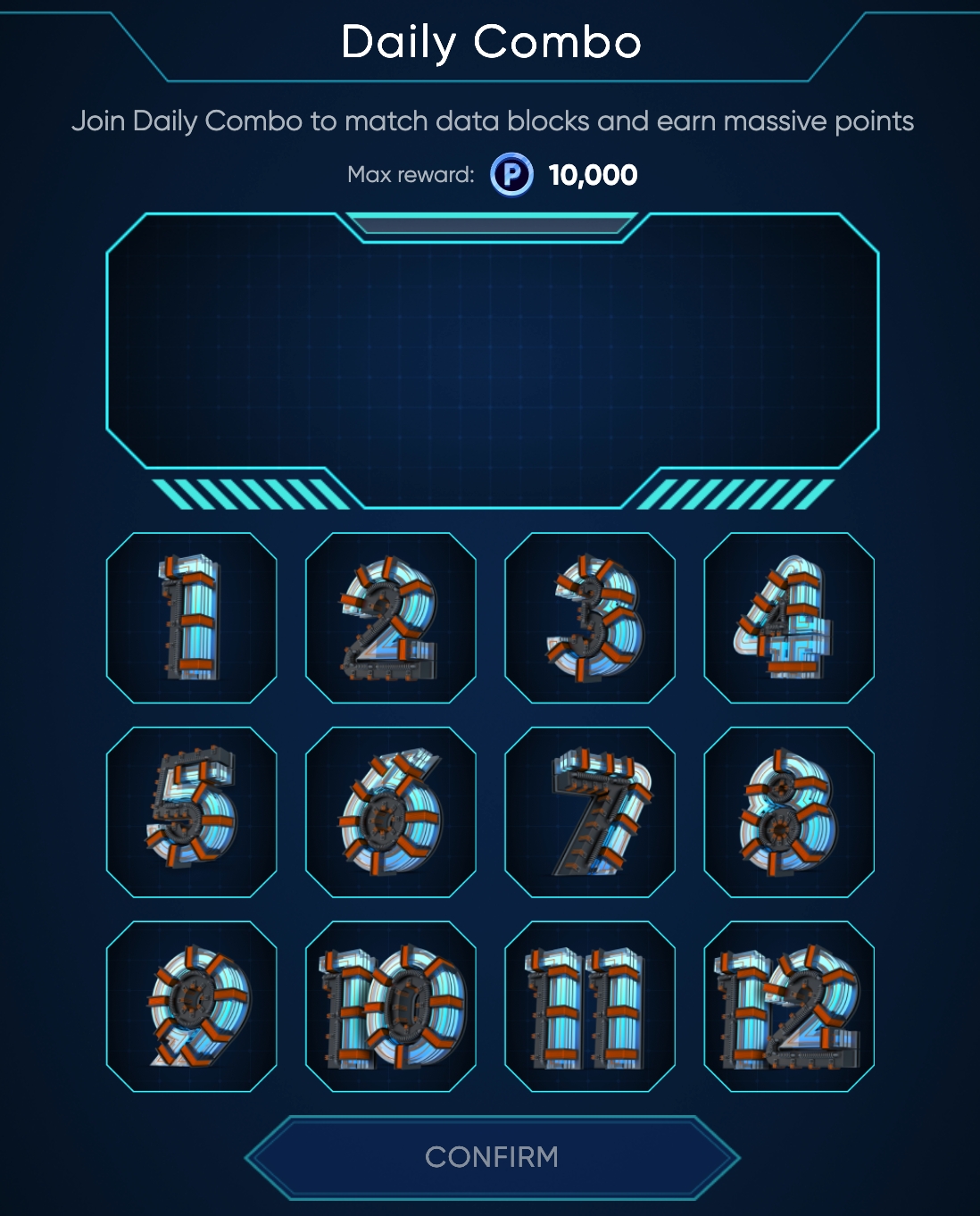 Daily Combo: The Daily Combo includes a set of 12 data blocks with a secret combination that changes daily. You need to place the correct 3 data blocks together. Points are awarded as follows: