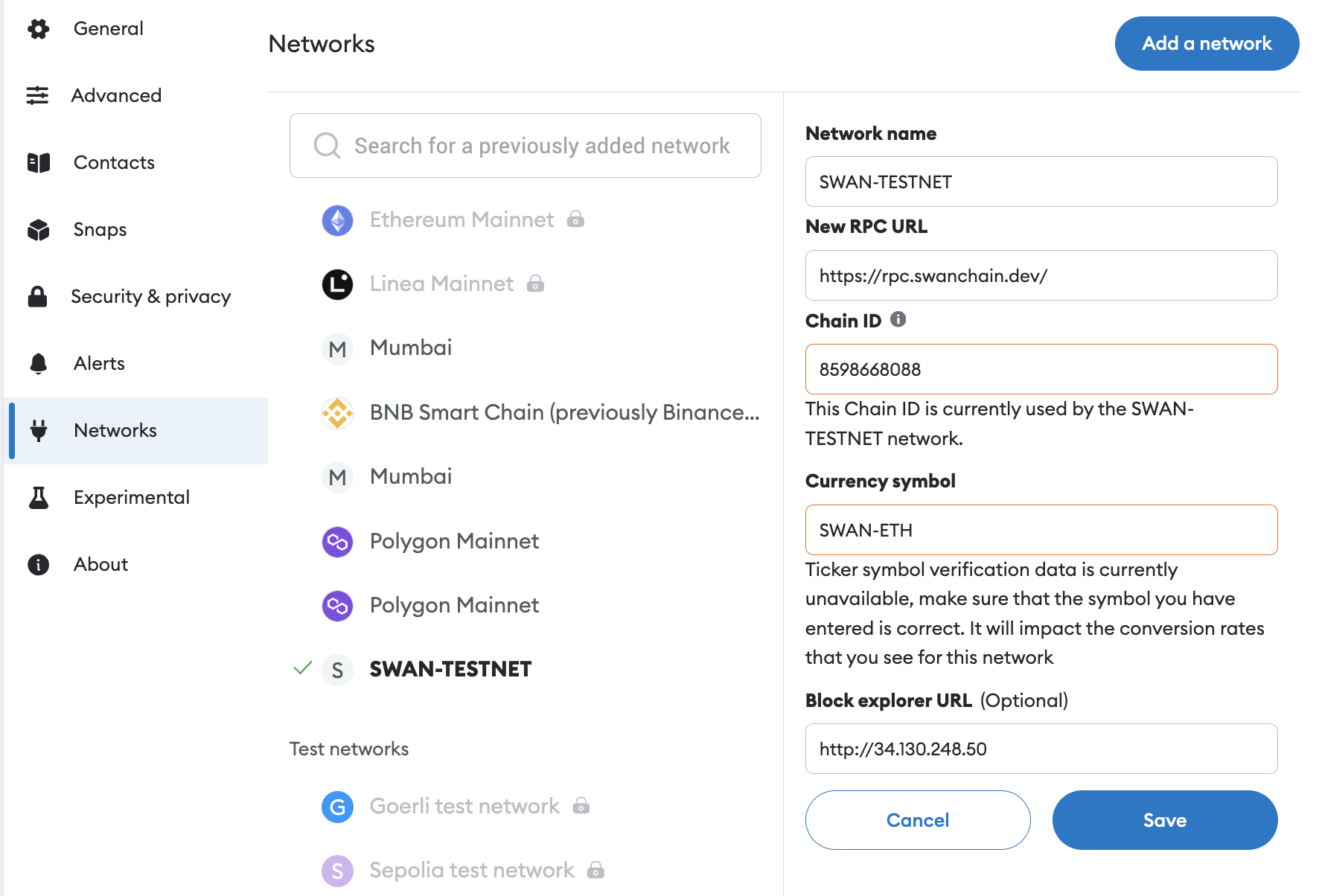 * RPC URL: <https://rpc-testnet.swanchain.io>
