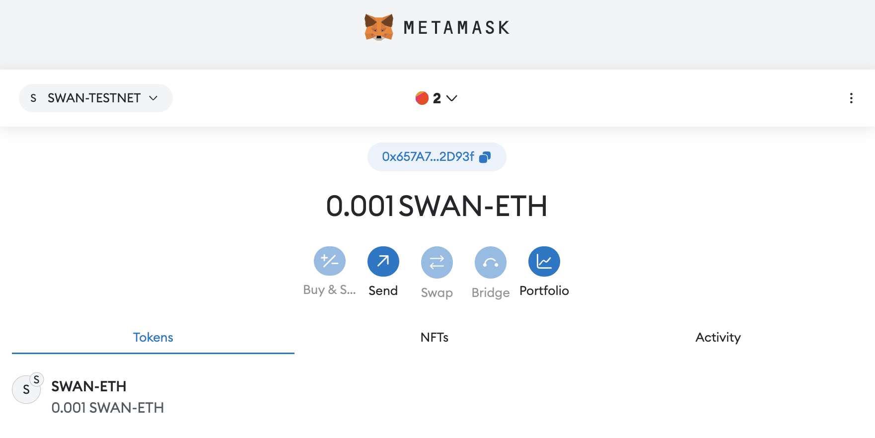 2.Switch to the Swan Testnet, Once the transaction is confirmed on the Goerli testnet, you should see the corresponding amount of SWAN-ETH tokens in your wallet on the Swan Testnet.